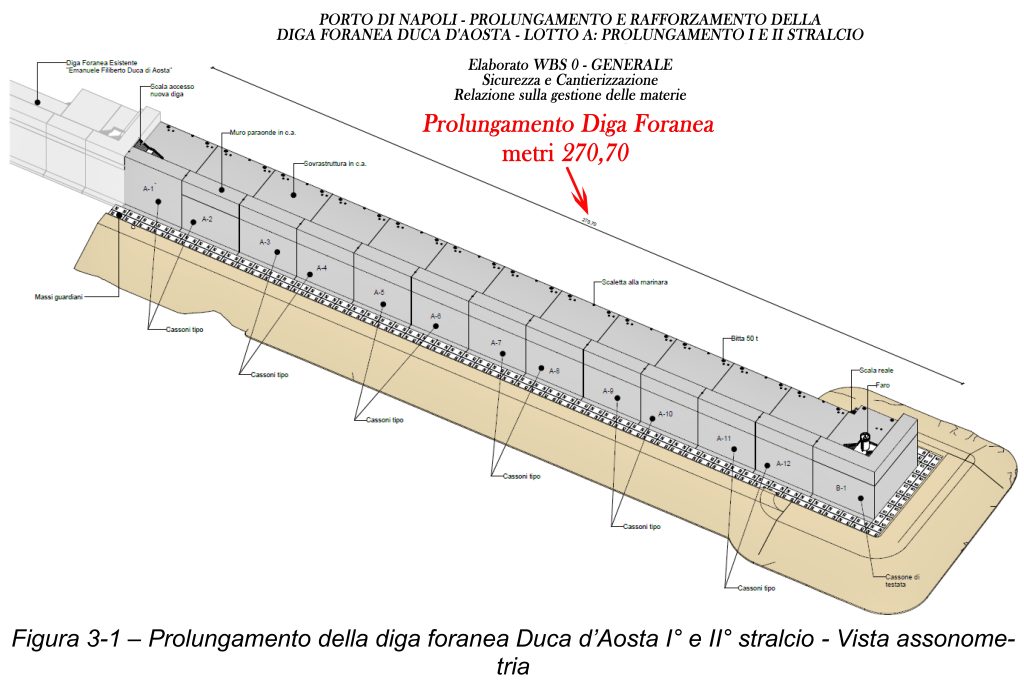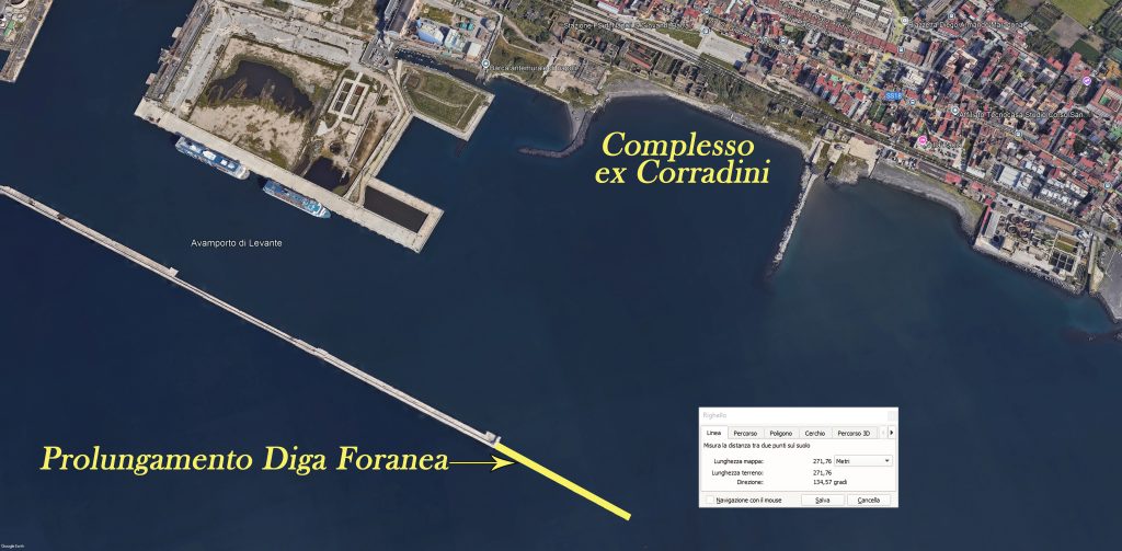 La Diga Foranea sarà allungata di ulteriori 271,70 metri mediante 13 cassoni cellulari modulari in cemento armato, posati nel tratto di costa antistante l’ex Corradini; essa si attesterà all’altezza dell’Alveo Volla–Pollena.