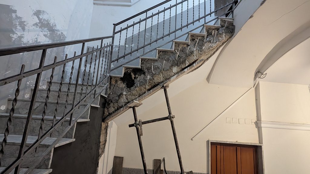 In merito alle lesioni riscontrate sul fabbricato, nessuno si è ancora espresso sulle cause, ivi compresa la proprietà. Nelle ultime ore, quest’ultima ha inoltre dato mandato per l’esecuzione dei lavori alla prima rampa di scale che conduce al primo piano.
